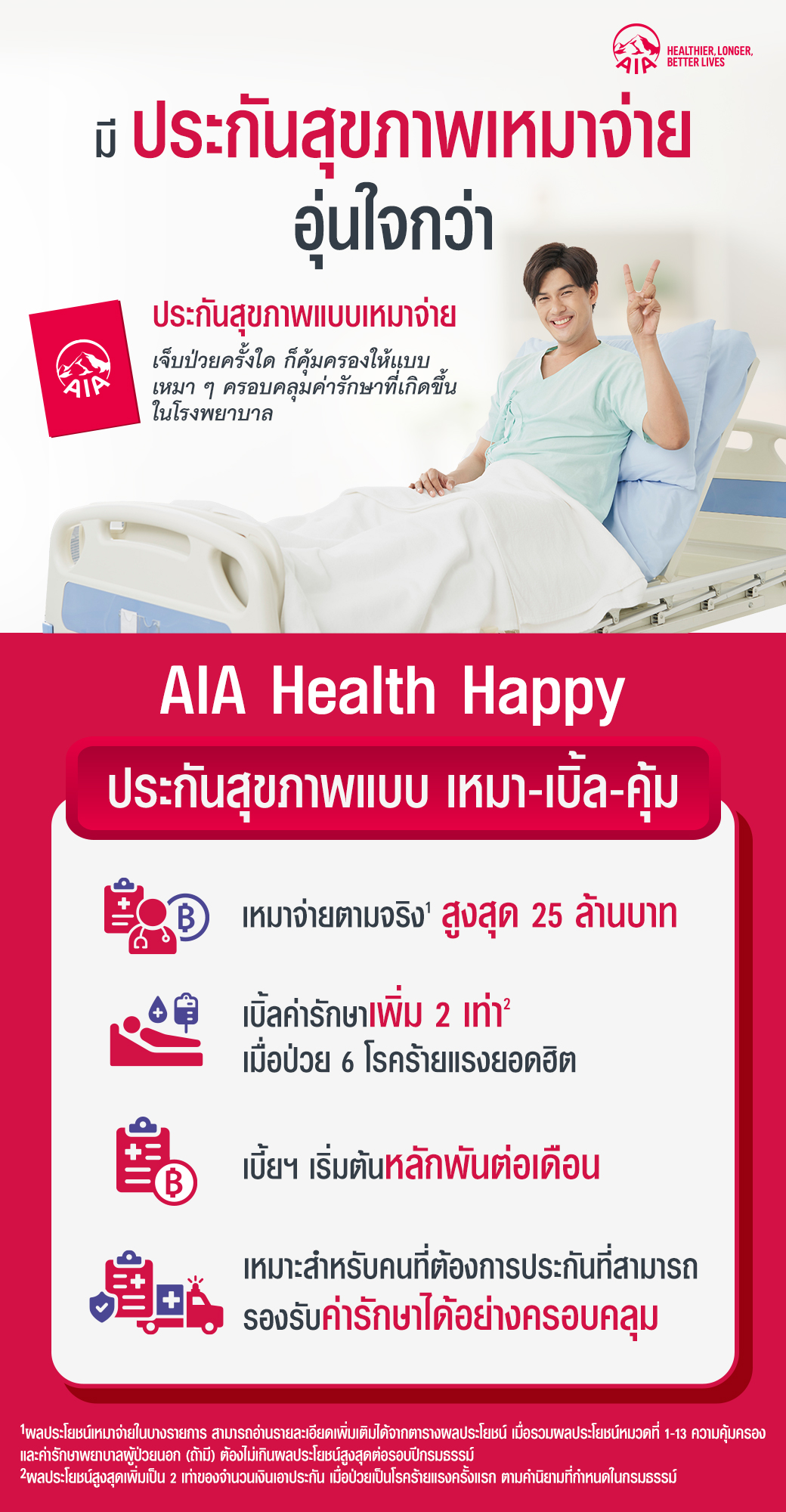 *ประกันสุขภาพแบบเหมาจ่ายที่รองรับการรักษาแบบผู้ป่วยนอก (OPD) ได้แก่ AIA Health Happy แผน 25 ล้าน และ AIA Health Saver แผน 400,000 และ 500,000 บาท