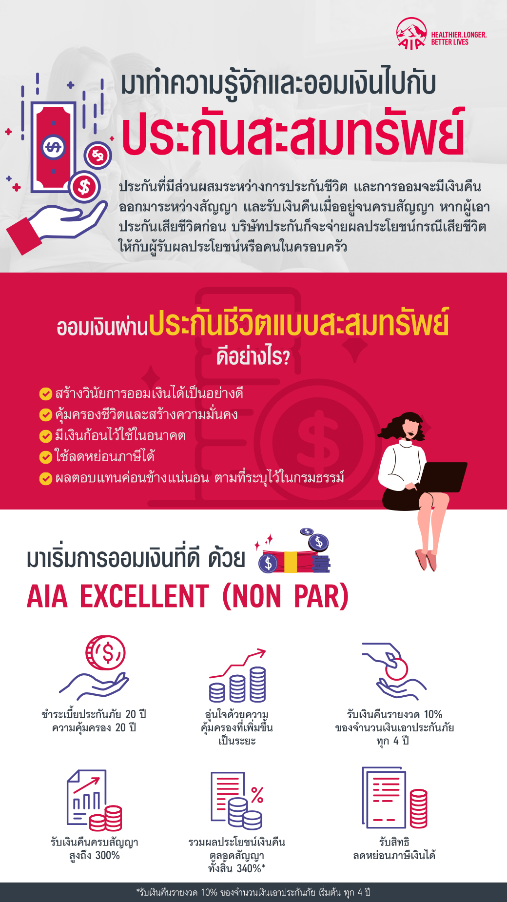 เห็นข้อดีแบบนี้ อยากออมเงินผ่านประกันสะสมกันแล้วใช่ไหม? ซึ่งประกันชีวิตแบบสะสมทรัพย์ที่ เอไอเอ อยากแนะนำสำหรับการออมนั่นก็คือ AIA Excellent (Non Par) ประกันชีวิตเพื่อการสะสมทรัพย์ ออมเงินสบายๆ ตรงเป้าหมายทางการเงิน พร้อมรับผลตอบแทนที่คุ้มค่า และความคุ้มครองที่มั่นคง