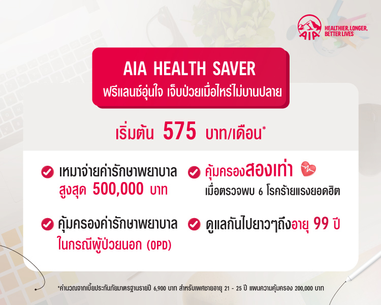 ดังนั้นการมีประกันสุขภาพ คือหัวใจสำคัญที่จะช่วยให้ฟรีแลนซ์มั่นใจว่าจะได้รับการดูแลทางการแพทย์ที่ดีในด้านการรักษาพยาบาล ทำให้ชีวิตสามารถไปต่อได้ด้วยความสบายใจ อย่าง AIA Health Saver ประกันสุขภาพแบบเหมาจ่ายที่คุ้มครองทั้งกรณีผู้ป่วยนอก (OPD) และผู้ป่วยใน (IPD) ให้คุณอุ่นใจแบบสบาย ๆ จ่ายเบี้ยฯ ได้ไม่หนักใจ
